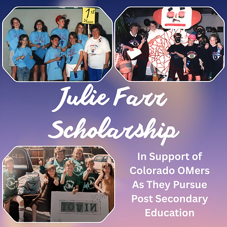 In memory of long-time Colorado Odyssey of the Mind supporter, Julie Farr, we are pleased to offer scholarship awards of $500. Scholarship awards may be applied toward the cost of obtaining an education at any university, college, community college, or specialized post-secondary school. Applicants must have been involved with Odyssey of the Mind, but do not need to be currently participating. Applicants must also be planning to attend a post-secondary education institution in the upcoming fall semester and have been involved in the Colorado Odyssey of the Mind program.